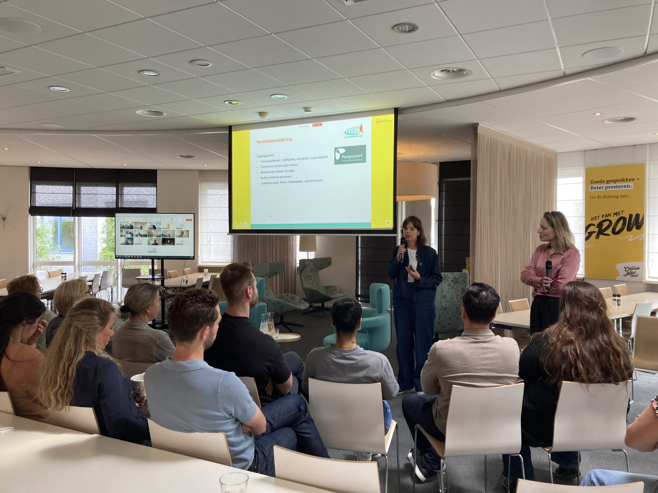 Nathalie de La Cousine, Anna Pastoor, beiden van Perspectief Herstelbemiddeling, deelden de wijze waarop Perspectief Herstelbemiddeling ingezet kan worden in de letselschaderegeling, Aandacht was er onder meer voor de zorgvuldige werkwijze van de bemiddelaars gedurende het traject van herstelbemiddeling en voor de borging van de privacy.